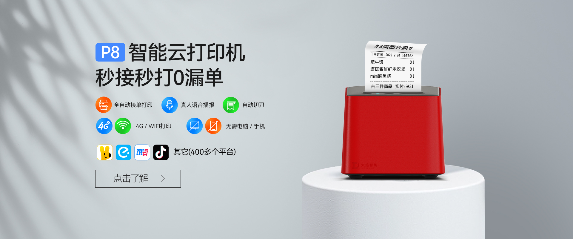 大趨智能,創(chuàng)立于2016年,位于深圳市南山區(qū),注冊(cè)資金2000萬(wàn)元,是國(guó)內(nèi)領(lǐng)先的智能支付解決方案供應(yīng)商,專注外賣云打印機(jī),熱敏打印機(jī),票據(jù)打印機(jī),藍(lán)牙打印機(jī),wifi打印機(jī)等智能云打印機(jī)設(shè)備。 旗下品牌小店掌柜主要致力于為中小微商戶提供SaaS服務(wù)一站式解決方案,具備業(yè)內(nèi)獨(dú)有的多項(xiàng)聚合功能,主要包括掃碼點(diǎn)餐、自營(yíng)外賣、聚合外賣、聚合管理、聚合營(yíng)銷、聚合配送等服務(wù),助力商戶低成本實(shí)現(xiàn)高效經(jīng)營(yíng),形成互利共榮的一體化生態(tài)系統(tǒng),提升收益與效率。